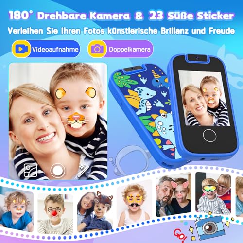 | Features | Verbessertes Kinder Smartphone: Wir stellen das 2,8-Zoll-Touchscreen kinder handy vor, das mit Autofokus, einer 8-MP-Doppelkamera und 1080P-Videofunktionen ausgestattet ist. Die Kamera verfügt über 23 bezaubernde Cartoon-Aufkleber, perfekt, um lustige Momente festzuhalten und sie mit Familie und Freunden zu teilen. Perfekte Geschenke und Spielzeuge für Jungen und Mädchen im Alter von 3 4 5 6 7 8 Jahren., Doppelkameras und Musikplayer: Mit Doppelkameras kann Ihr Kind mit diesem Kinderspielzeugtelefon mühelos Selfies machen und schöne Erinnerungen bewahren. Es verfügt außerdem über hochwertige Lautsprecher und unterstützt eine 3,5-mm-Kopfhörerbuchse, was es zu einem idealen kinderhandy Spielzeug für junge Musikliebhaber macht. Unterstützt 4-5 Stunden kontinuierliches Fotografieren oder Musikwiedergabe nach dem Aufladen. Die integrierte 8-GB-Speicherkarte bietet Platz für Tausende von Fotos., Multifunktionales Kinderhandy: Dieses Spielzeug Handy ist mehr als nur ein Telefon. Es fungiert als Digitalkamera, Musikplayer und Videoplayer. Zu den zusätzlichen Funktionen gehören eine Uhr, ein Taschenrechner, ein Diktiergerät, eine Stoppuhr und ein Kalender. Es bietet außerdem 13 interaktive Spiele, die das logische Denken, die Reaktionsfähigkeit und die Hand-Auge-Koordination von Kindern fördern. Der „Anti-Sucht“-Modus der Kindersicherung hilft dabei, die tägliche Spielzeit zu verwalten., Sichere und Langlebige Konstruktion: Dieses Kinder Smartphone wurde aus hochwertigem ABS-Material gefertigt und ist so konzipiert, dass es die Sicherheit und den Komfort für die Haut Ihres Kindes gewährleistet. Die einstellbare Bildschirmhelligkeit schützt junge Augen, während das stoßfeste Gehäuse einen effektiven Fallschutz bietet und eine lange Nutzungsdauer gewährleistet. Dank seiner kompakten Größe und des mitgelieferten Tragebands können Kinder es leicht mit sich herumtragen., Ideales Geschenk für Kinder: Dieses Kinderspielzeug ist das perfekte Weihnachts, Feiertags, Schulanfangs und Geburtstags geschenk für Jungen und Mädchen im Alter von 3, 4, 5, 6, 7 und 8 Jahren. Mit diesem entzückenden Spielzeug hat Ihr Kind sein eigenes Smartphone, wodurch das Risiko verringert wird, dass Ihr Telefon ausgeliehen wird, und sowohl Ihnen als auch Ihrem Kind mehr Freude bereitet wird. |