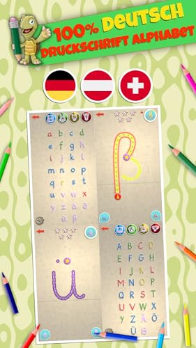 | Features | 16 Sprachen, die alle von der Benutzeroberfläche unterstützt werden, und Stimmen von Muttersprachlern für die Aussprache der Buchstaben/Zahlen und kompletten, offiziellen Alphabete. (ENGLISH, ESPAÑOL, FRANÇAIS, DEUTSCH, ITALIANO, PORTUGUÊS, NEDERLANDS, SVENSKA, NORSK, DANSK, SUOMI, ROMÂNĂ, JĘZYK POLSKI, TÜRKÇE, BAHASA INDONESIA and BAHASA MELAYU), 3 bekannte Buchstabenschreibregeln, um dem Kind die Flexibilität zu lassen, die richtige Strichreihenfolge und -richtung auszuwählen. Essentiell, um sich an Schlüsselbegriffe und Regeln des Schreibens zu gewöhnen., Beinhaltet die 10 meistgenutzten Schreibarten der Welt, um Druckschrift zu lernen: ZB-Stil, HWT-Stil, DN-Stil, Deutscher (Hamburger) Stil und Euro Latino., Unterstützt Links- und Rechtshänder., 5 Schwierigkeitsgrade mit AUTO- und LOCK-Einstellungen, von begleitetem Schreiben für Anfänger bis hin zu Freihandschreiben mit minimaler Unterstützung und strenger Evaluierung., 4 Zeichenarten: ABC (gesamtes Alphabet in Großbuchstaben), abc (gesamtes Alphabet für kleine Buchstaben), 123 (Zahlen von 0 bis 9) und ein Set besonderer Zeichen für lustige Übungen., 5 Entwicklungsstufen, farbkodiert für jede Zeichenart, damit Eltern und Lehrer den Fortschritt und die meistgeübten Buchstaben direkt erkennen., 16 lustige Belohnungssticker, die bei Erreichen eines Meilensteins vergeben werden. Außerdem Zeichenregeln, nach jedem vollendeten Fortschritt des Alphabet-/Zeichenlevels., 3 einrichtbare Profile mit 50 lustigen Avataren und individuellem Namen, um unabhängig Einstellungen und Fortschritt zu speichern., Landschafts- und Portraitorientierung wird vollstens unterstützt. |