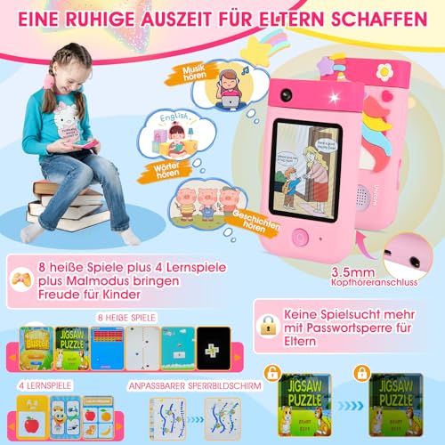 | Features | 【Erweiterte Funktionen als All-in-One-Player】 2,8" Touchscreen-Kinderkamera mit 180° drehbarem Objektiv, ausgestattet mit frühpädagogischen Funktionen (Nur in der englischen Version. Die Funktionen werden durch die Änderung der Sprache nicht verändert.)wie Malmodus, Spiele, Taschenlampe, Quiz, Audio-Comic. Einfach zu bedienen. Diese smarte Kamera bietet 1080P-Videoaufzeichnung, Stoppuhr, Timer, MP3-Player und weitere Unterhaltungsmöglichkeiten. Es ist nicht nur ein Spielzeug ab 3-8 Jahre, sondern auch eine multifunktionale Unterhaltungs-Digitalkamera. Entwickelt fürfür Mädchen und Jungen 3 4 5 6 7 8 Jahre, 【180° drehbare Objektiv digitalkamera kinder für schöne Momente】 Sofortbildkamera sind mit 180° drehbaren Kameras ausgestattet, um Fotos und Videos aufzunehmen, und lassen sich schnell zurückdrehen, um mühelos ein gutes Selfie zu machen. Außerdem gibt es 5 verschiedene Arten von 27 niedlichen Aufklebern, mit denen über 100 schöne Fotokombinationen erstellt werden können. Kinder können Fotos mit Familie und Freunden aufnehmen, um wunderbare Momente festzuhalten., 【Sicheres Material mit Lernwerkzeugen】Das ZUEOKAI Smart Camera Spielzeug besteht aus zuverlässigem, langlebigem Material. Die ZUEOKAI Kleinkinderkamera ist vollständig mit einem geruchsfreien und hautfreundlichen Silikongehäuse umhüllt, das sicherer und langlebiger für Ihre Kinder ist. Außerdem sind interessante frühpädagogische Werkzeuge vorinstalliert, wie z.B. Audio-Comics, um gute Gewohnheiten bei Ihren Kindern zu fördern., 【Kreative DIY-Kamera als Geschenk für Kinder】 Die ZUEOKAI Kinderkamera ermöglicht es Kindern, eigene Hintergrundbilder mit selbst gemalten Kunstwerken oder aufgenommenen Fotos zu gestalten. Jedes Mal, wenn Kinder ihre Kamera einschalten und ihr selbst gestaltetes Hintergrundbild sehen, hebt dies ihre Stimmung. Eine gute Wahl für Weihnachts-, Geburtstags- und tägliche Geschenke für Mädchen und Jungen., 【100% Zufriedenheitsservice】Wenn Sie Anliegen oder Unzufriedenheit mit dem Produkt haben, kontaktieren Sie uns bitte per E-Mail: yuxiaman@outlook.com, und wir bieten Ihnen einen 100% zufriedenstellenden Kundenservice. 【Packungsliste】 1 Stück = 1 * Smart-Phone-Spielzeug + 1 * USB-Typ-C-Ladekabel + 1 * 32GB TF-Karte + 1 * Benutzerhandbuch + 1 * Umhängeband + 1 * Geschenkbox. |