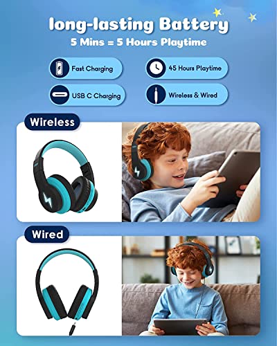 Bluetooth Kopfhörer Kinder, kabellose Bluetooth Kinderkopfhörer Over Ear mit 85dB/94dB Lautstärkebegrenzung, 45H Spielzeit, 3 Lightning-Modi, eingebautes Mikrofon Kopfhörer für Handy Tablet Schule